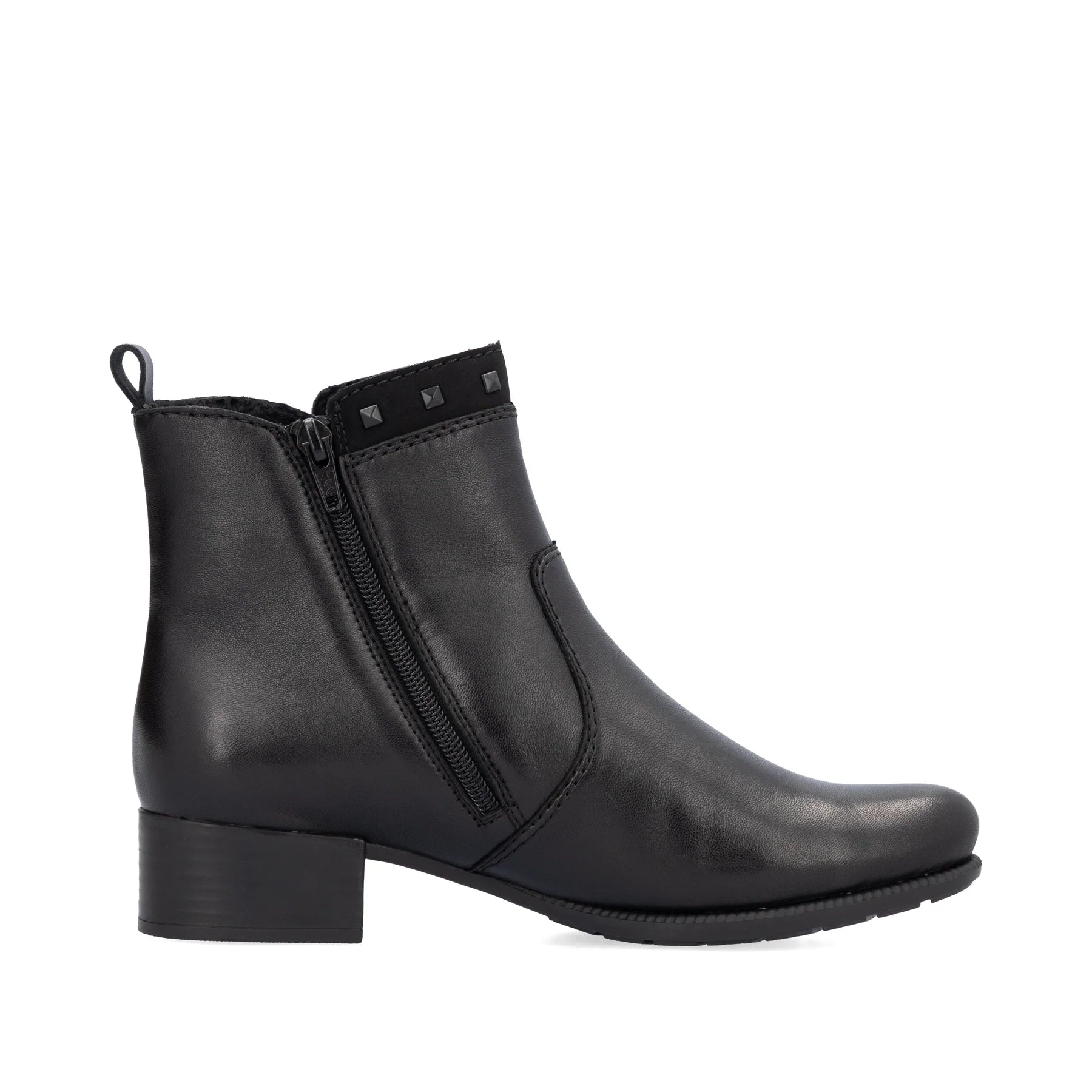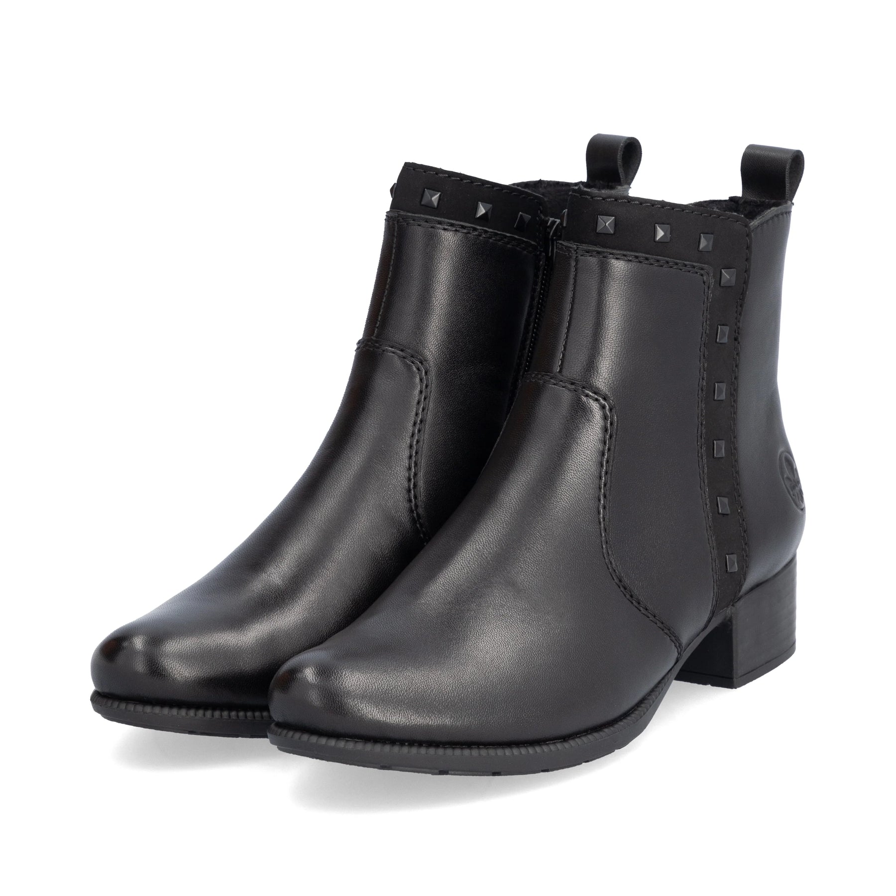 Stylish or comfortable? Why or? These matt black Rieker ankle boots made of smooth leather guarantee a heavenly feeling. Made with the stitchdown construction, the model is robust, flexible and offers a perfect fit. The zipper makes it easy to put on and take off the shoe. The decorative studs provide the perfect finish and a striking look. The sole with block heel is grippy and ensures good traction at all times. Simply top!