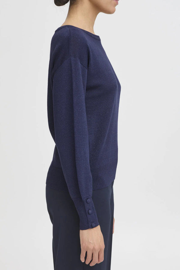 A simple, sparkly boatneck top crafted from a lightweight viscose knit and shot through with silky metallic yarn. The full sleeves feature a refined touch with three covered buttons at each cuff, making this an effortless piece that moves beautifully from day to evening.