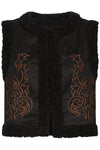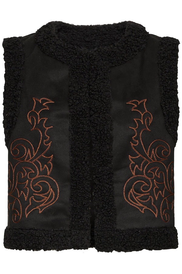 The Billan Waistcoat by B.Young is a striking blend of folk-inspired embroidery and modern layering. Crafted from 100% polyester, it features a rich true black base adorned with ornate reddish-brown embroidery in swirling botanical motifs. Faux shearling trims along the collar, armholes, and hem add tactile warmth and visual contrast, making this piece a standout in any autumn edit.