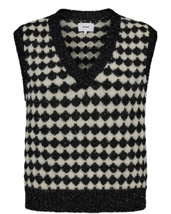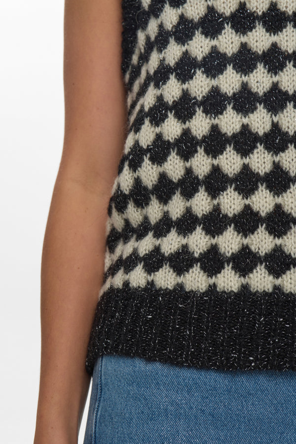 Layer up in luxe texture with the NUBILA Vest in deep caviar. This sleeveless knit blends acrylic, wool, alpaca, and metallic yarn for cozy warmth with a subtle shimmer. Perfect for styling over shirts or dresses, it adds a touch of sparkle to everyday looks.