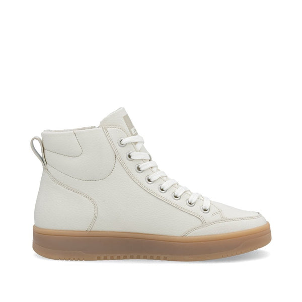 Step into sleek winter style with these high-top Rieker boots, designed to blend fashion-forward design with everyday comfort. The soft cream-white finish, side zip, and padded collar offer a modern silhouette with practical ease.